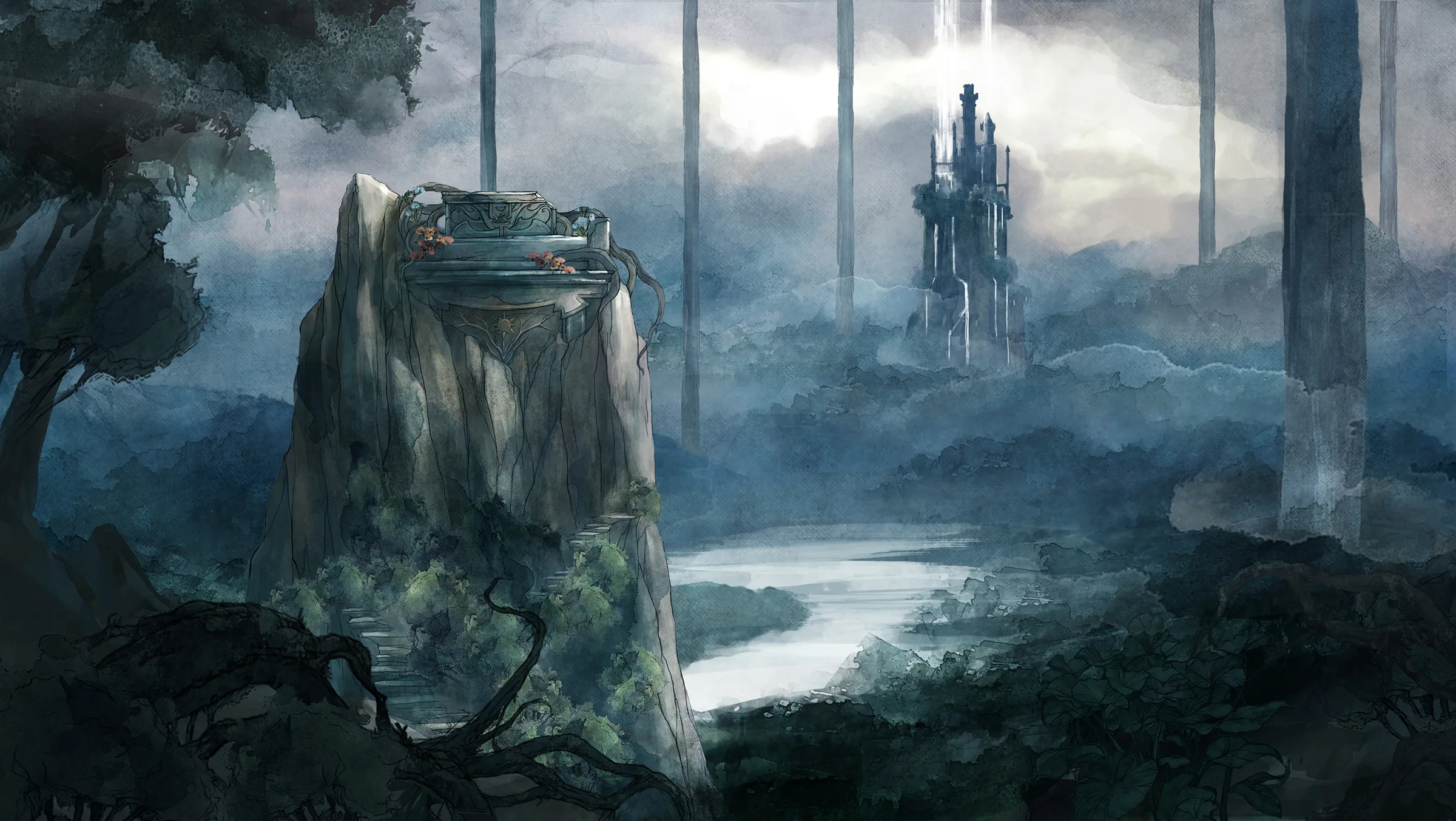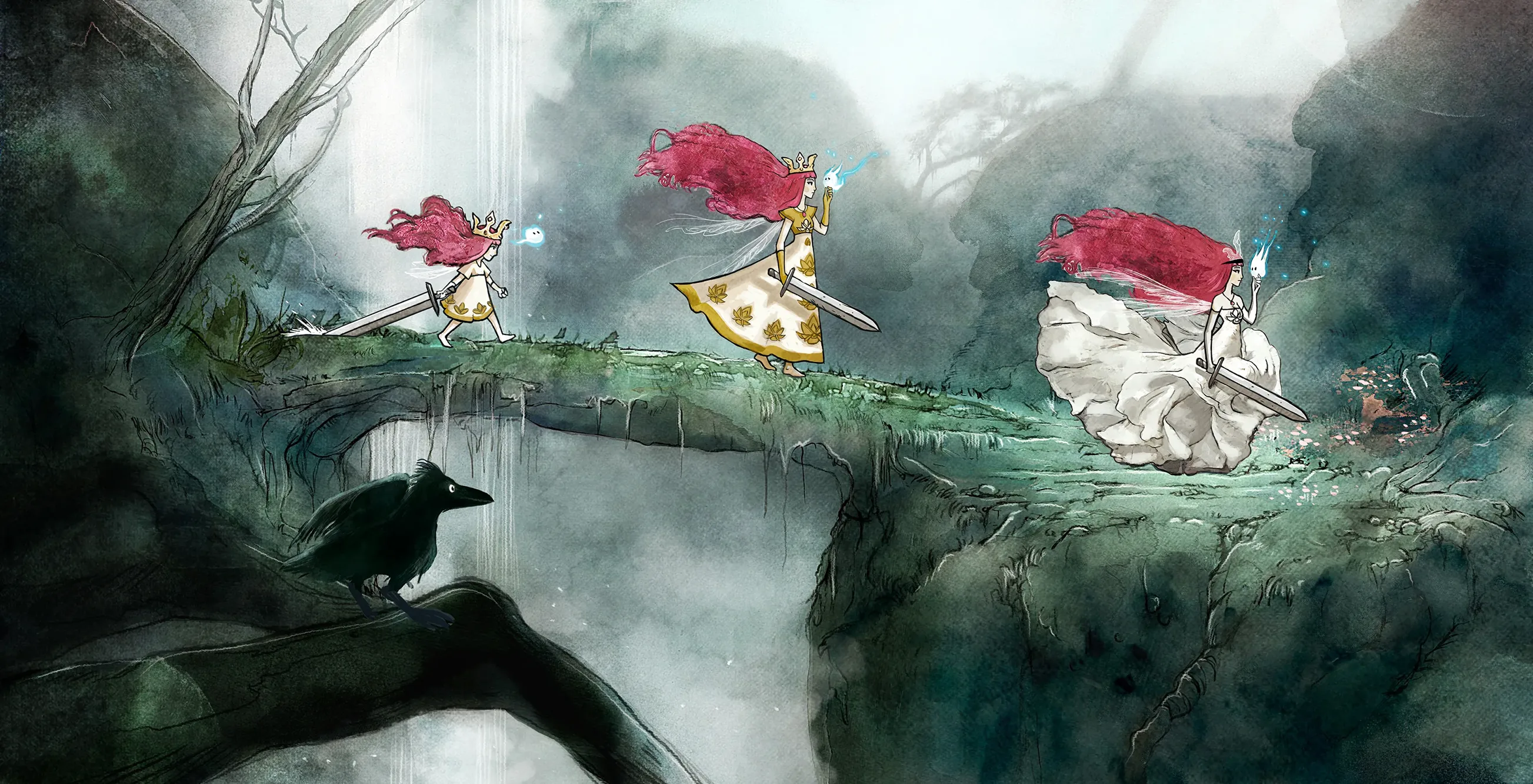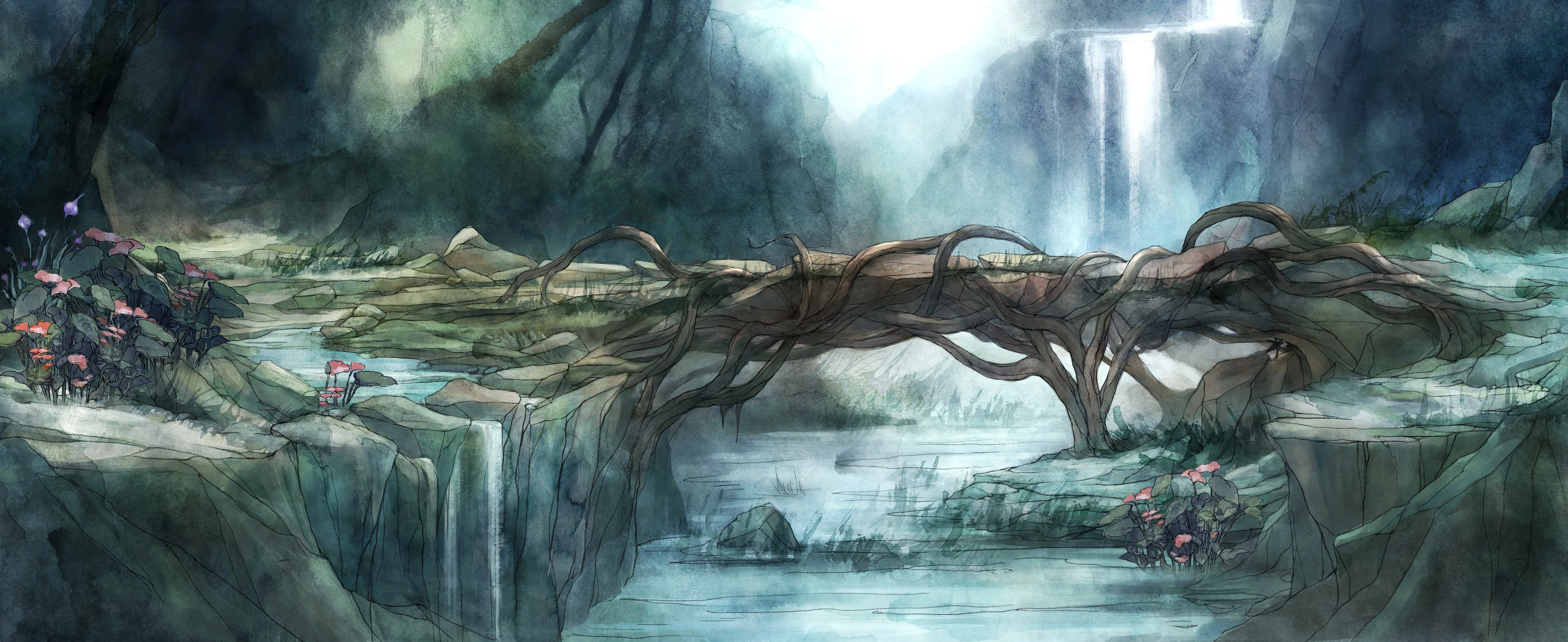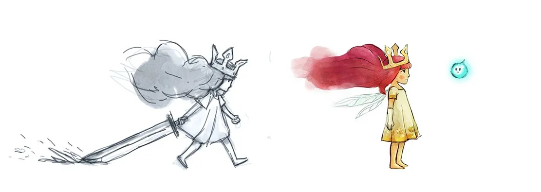 For Child of Light, my aim was to create a world that feels like being awake in an underwater dream. We really put forward the watercolor effect to make every environment float as if the entire world were breathing beneath the surface. The intention was to merge the delicacy of illustrated fairy tales with a dreamlike, melancholic atmosphere suspended in time.